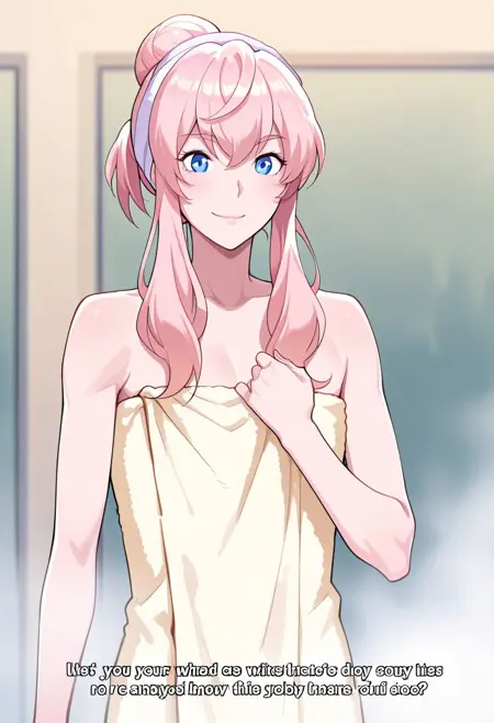 masterpiece,best quality,amazing quality, akoyage+, blue eyes,blue eyes, femboy, 1femboy , solo, towel, pink hair, long hair, blue eyes, english text, half naked , steam bathroom , parody, smile, headband