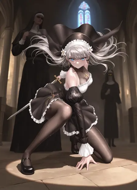 关键词:SiNiSistar2,1 girl,long hair,nun,large breasts,blue eyes,frilled dress,earrings,bangs,black dress,detached sleeves,long sleeves,gray hair,hair flower,bare shoulders,cross necklace,white headband,see-through clothes,see-through cleavage,black pantyhose,mole near breasts,