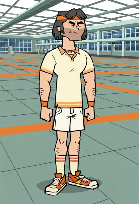PeteTDRR, 1boy, shaggy black hair, cream colored polo shirt with orange accents, white shorts, cream colored and orange striped socks, dark orange sneakers, orange headband, black eyes, thick eyebrows, dark orange wristbands, yellow necklace
