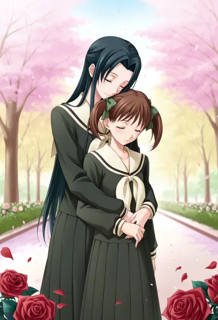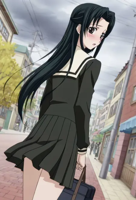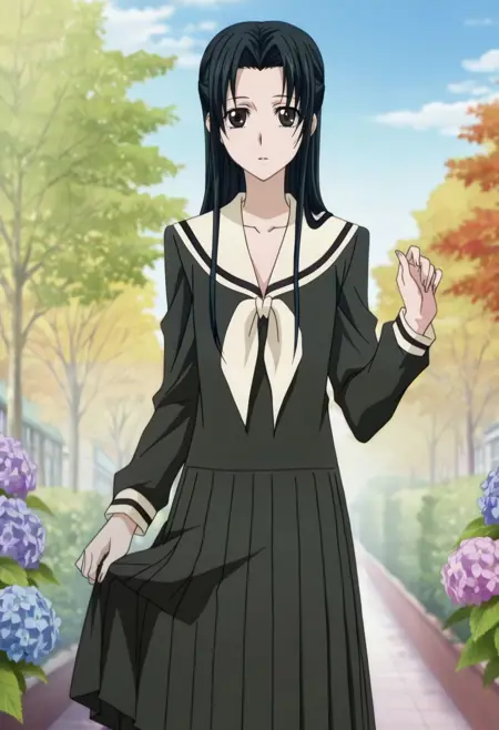 Basic prompt: hosokawa_kanako, 1girl, solo, long hair, skirt, black hair, black eyes, long sleeves, school uniform, serafuku, lillian_girls'_academy_school_uniform