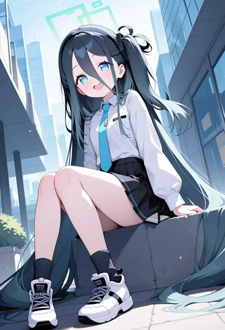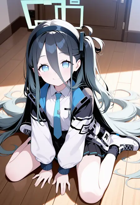 aris-default, aris \(blue archive\),blue eyes,black hair,one side up,absurdly long hair,hair between eyes,black hairband,halo,white shirt,white long sleeves,necktie,pleated skirt,black socks,sneakers