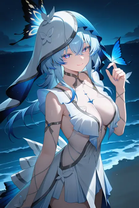 shorekeeper (wuthering waves), 1girl, veil, dress, butterfly, purple eyes,