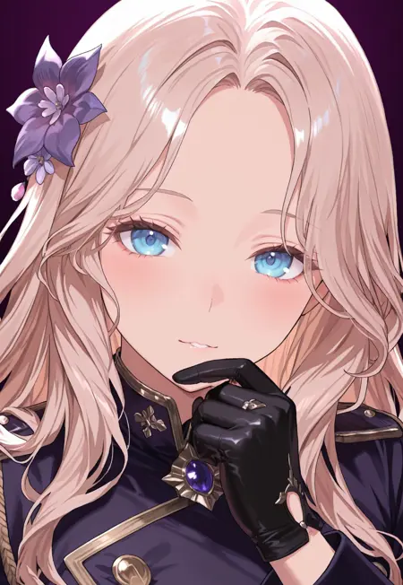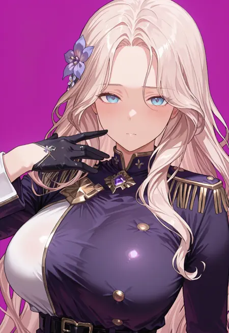 Darian-YD, large breasts, blue eyes, long wavy hair, white hair, hair flower, purple_military_uniform, asymmetry top, white layered top, epaulette, brooch, black gloves, black belt, pelvic curtain, white pantyhose, white high heels,