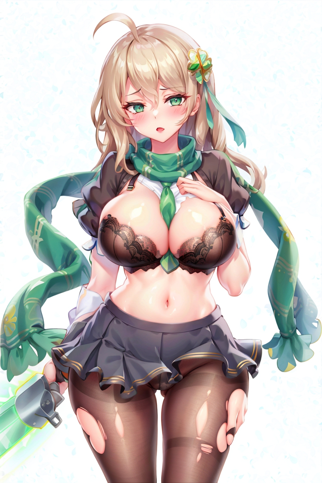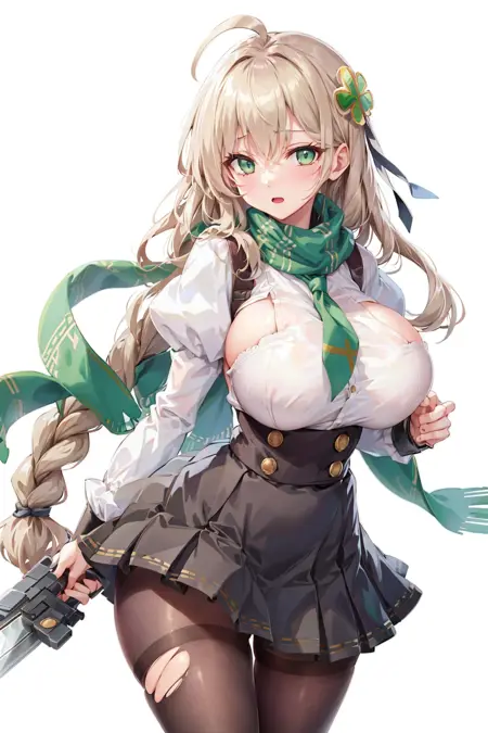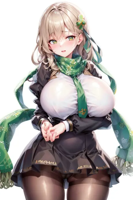green scarf, green necktie, school uniform, framed breasts, pleated skirt, black skirt, white shirt, puffy long sleeves, brown pantyhose,