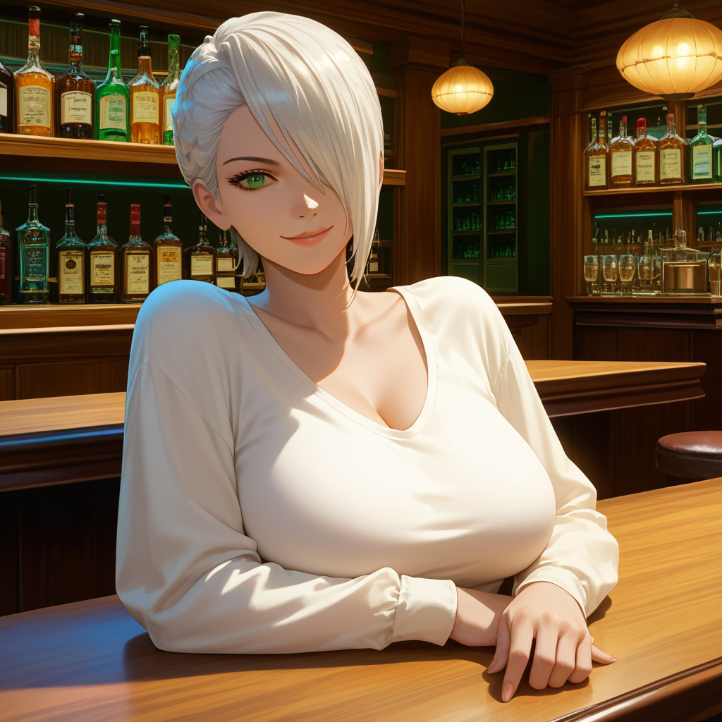 支持词:白发,短发,头发遮住一只眼睛,绿眼睛,