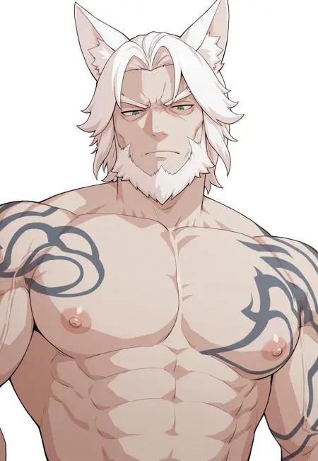 기본: hoolay_hsr, 하얀 머리, 동물 귀, 여우 귀, 녹색 눈, 안면 수염, 수염, 꼬리