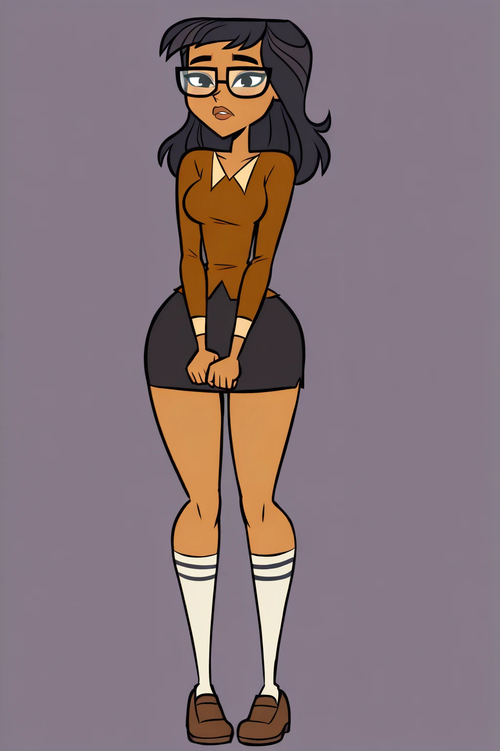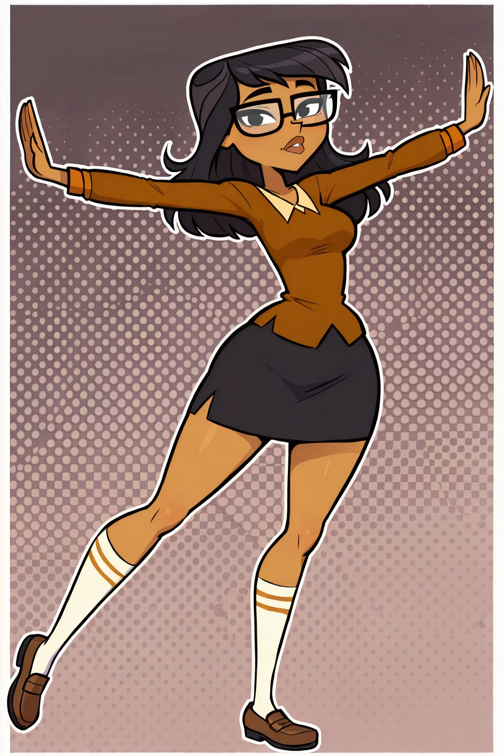 EllodyTDRR, 1girl, tan skin, dark black hair, large square black glasses, brown sweater, cream colored shirt, dark black skirt, knee-high cream colored socks, brown shoes, black eyes, lips, big lips, Ellody (tdi)