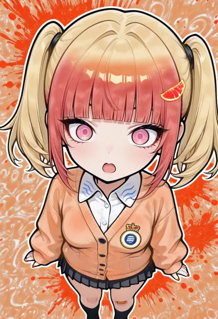 medium hair, twintails, blunt bangs, multicolored hair, gradient hair, red hair, yellow hair, hair ornament, pink eyes,