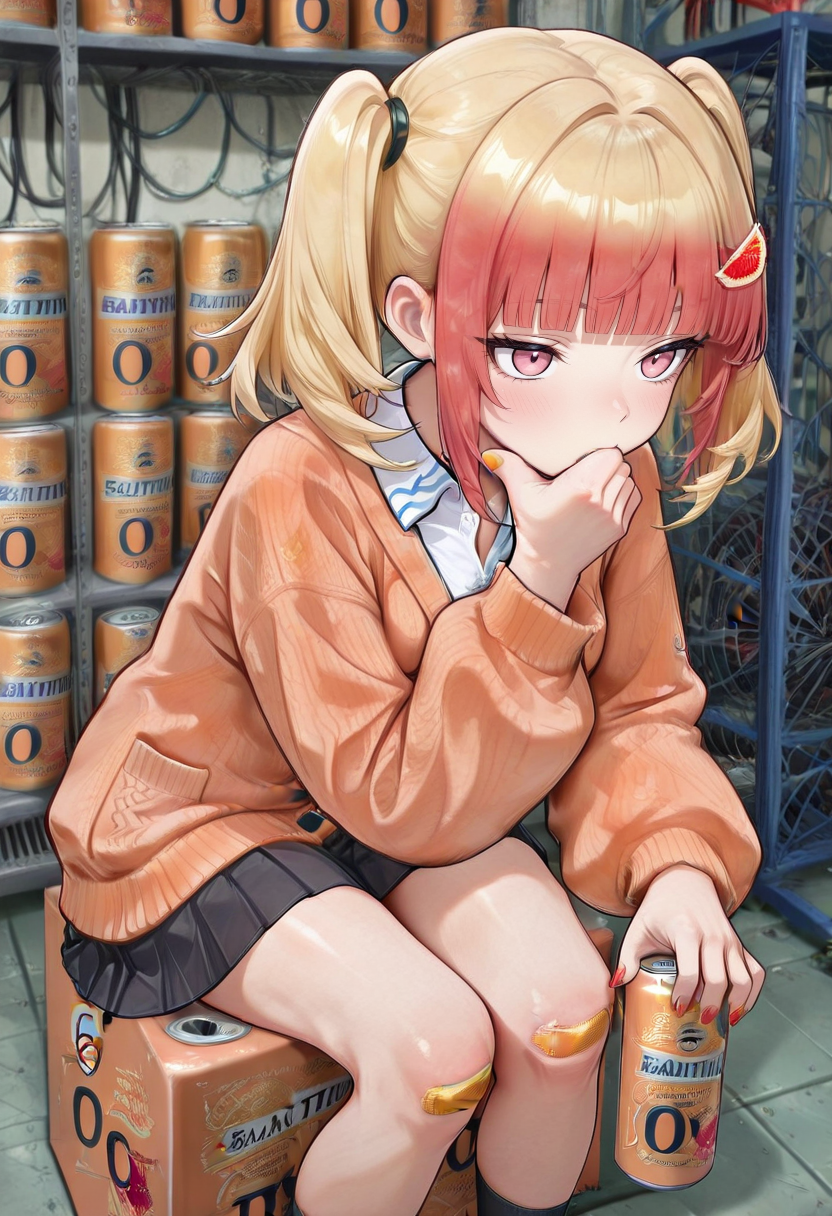 orange cardigan, collared white shirt, pleated black skirt, nail polish, bandaid on leg,