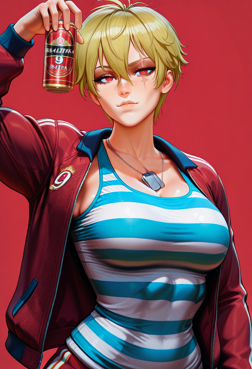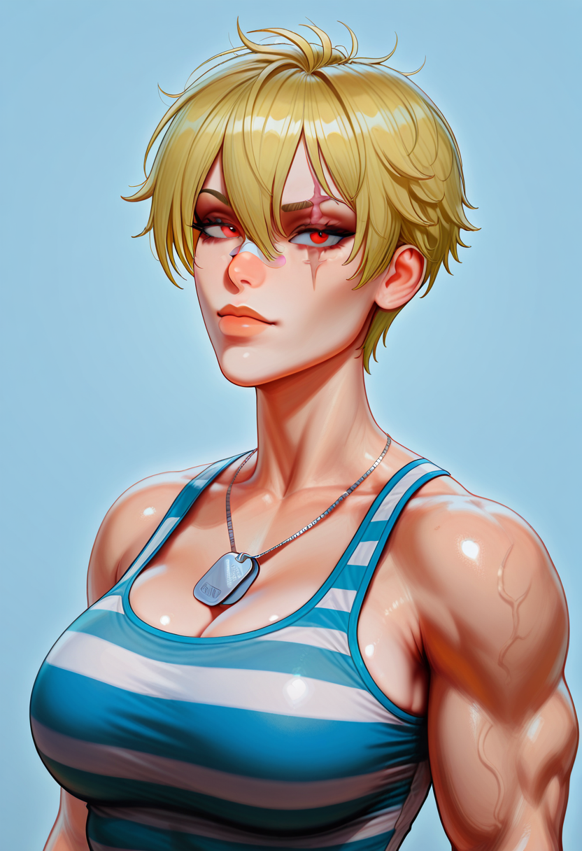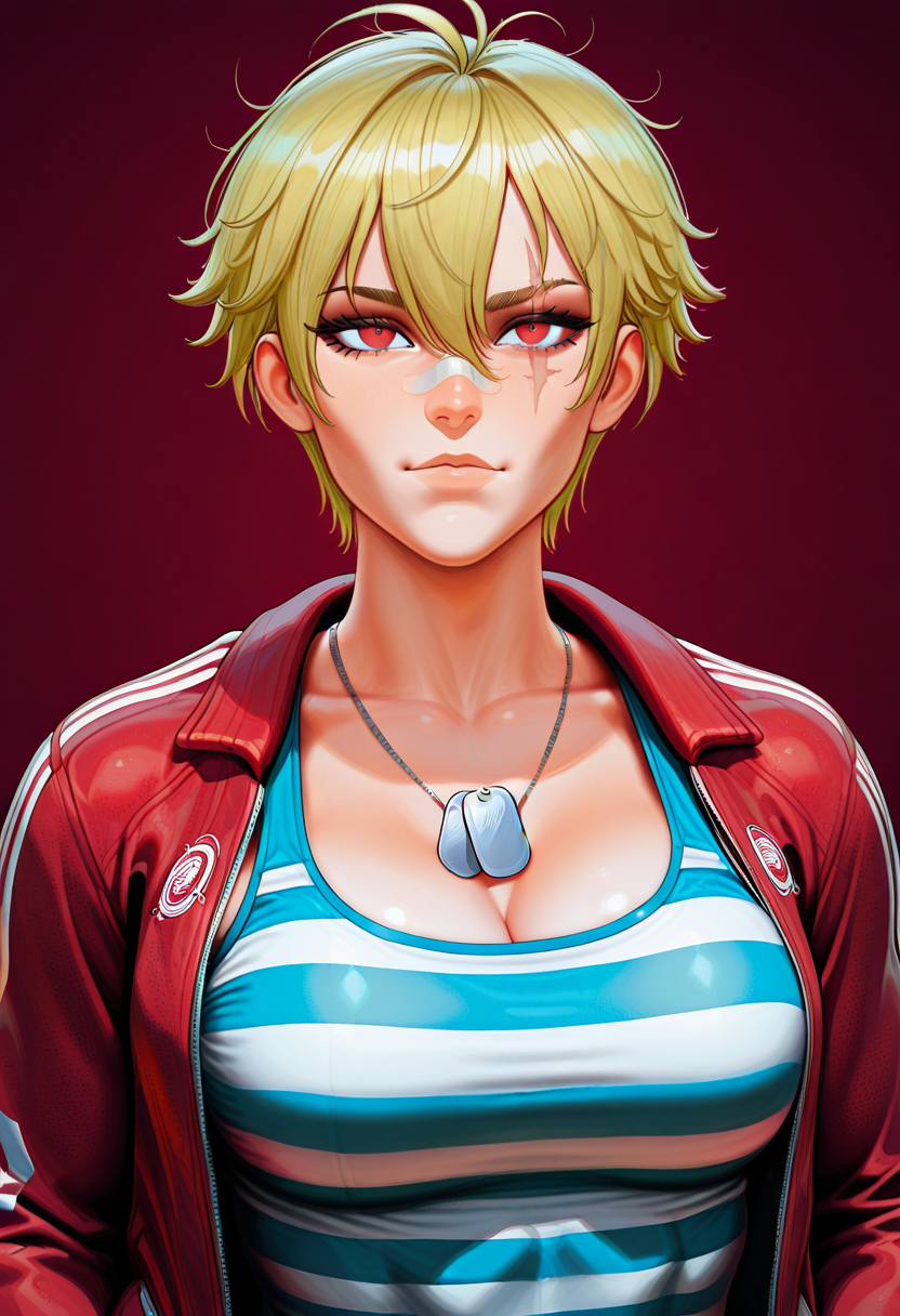 blonde hair, short hair, hair between eyes, red eyes, long chin, wide jaw, scar across eye, bandaid on nose, muscular,