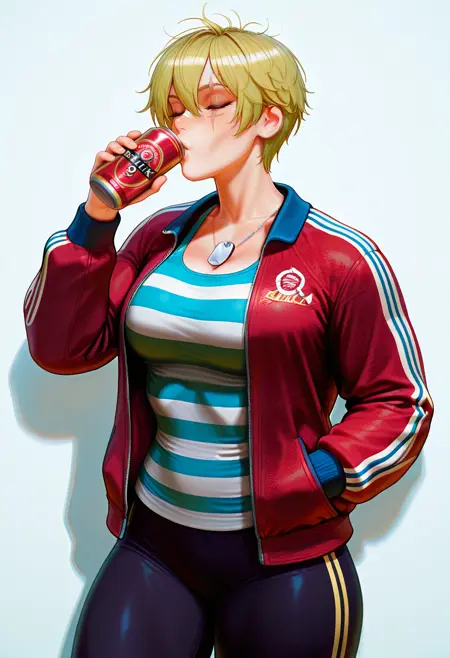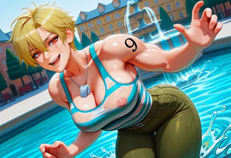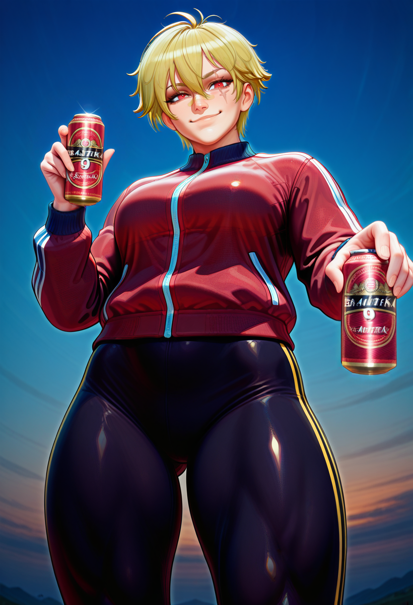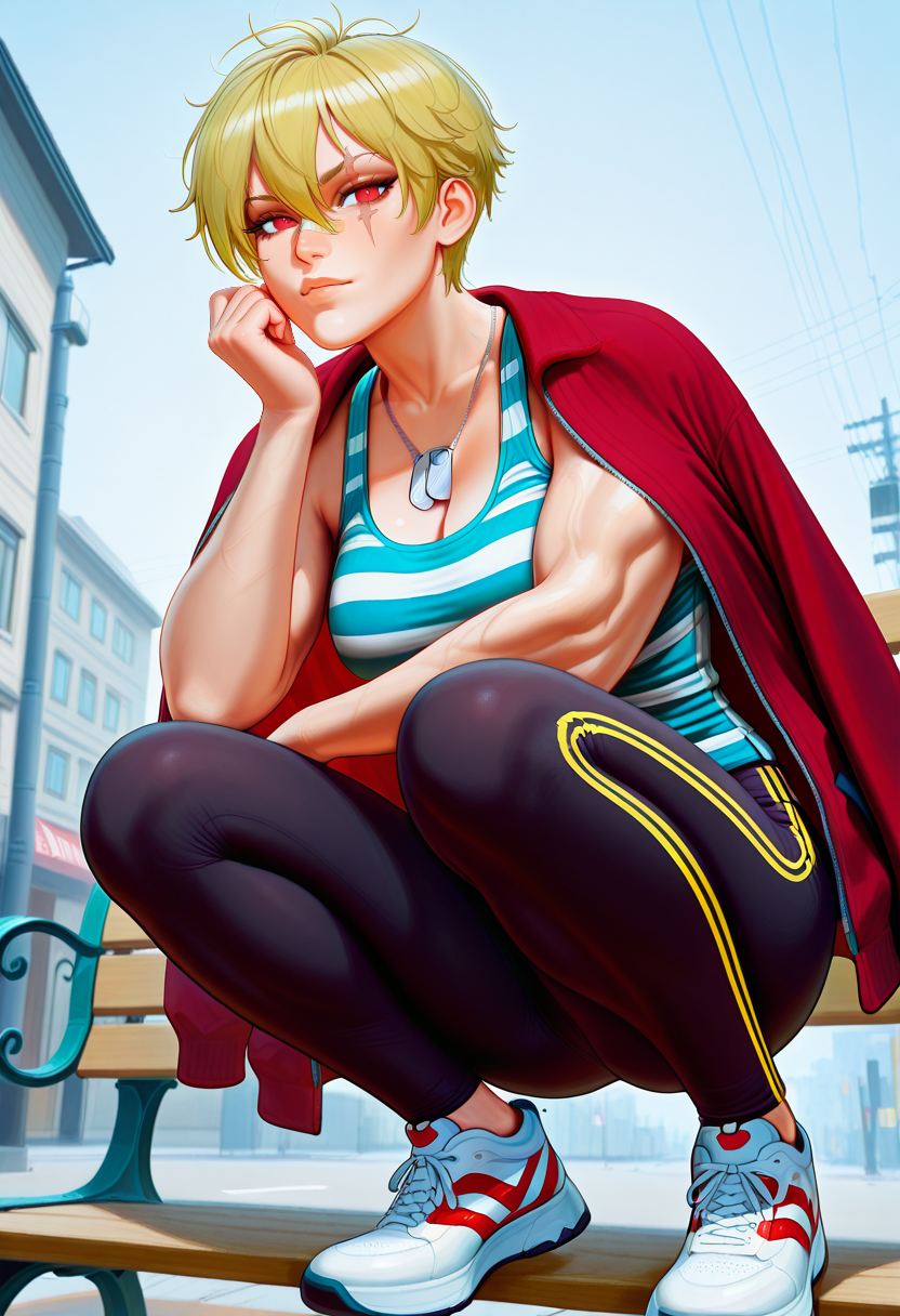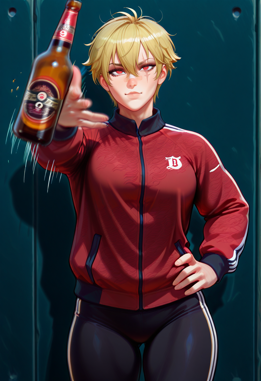 blonde hair, short hair, hair between eyes, red eyes, long chin, wide jaw, scar across eye, bandaid on nose, muscular,