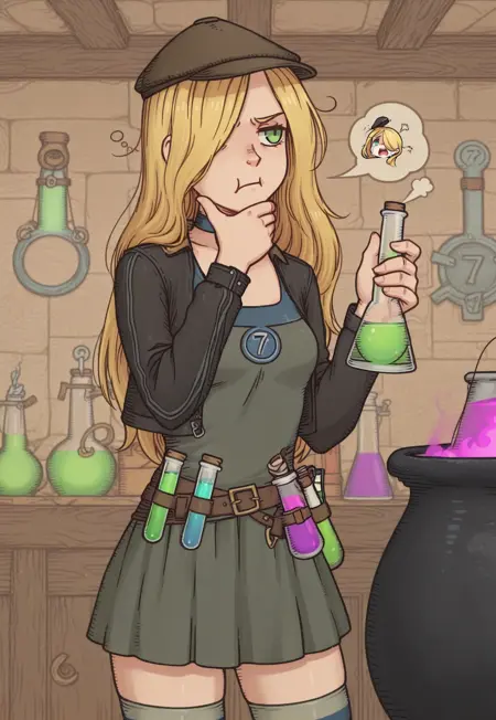 blonde hair, long hair, hair over one eye, green eyes,