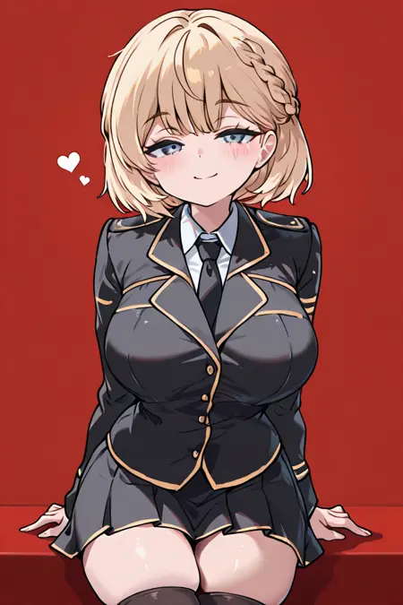 Prompt: Abbey-Liver020, blonde hair, blue eyes, short hair, 1girl, solo, military uniform, black tie, large breasts, braid, cowboy shot, zettai ryouiki, black thighhighs, small braid, black uniform, very aesthetic, high quality,highly detailed