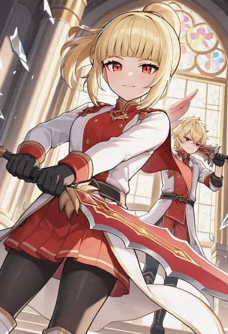 zero_beta,1girl,solo,blonde hair,ponytail,blunt bangs,red eyes,gloves,one wing,black gloves,boots,red skirt,white jacket,