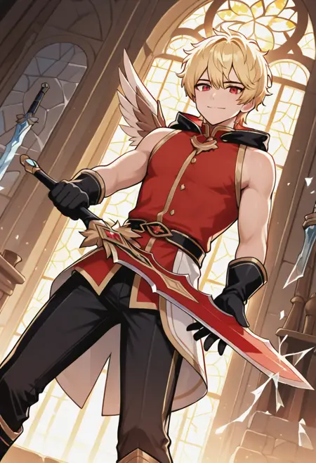 zero_alpha,1boy,solo,blonde hair,short hair,red eyes,gloves,one wing,black gloves,boots,pants,red shirt,long sleeves,white jacket,sleeveless jacket,black hood,hood down,