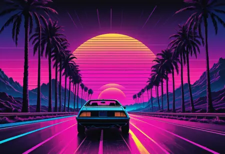 네온 조명, 레트로 차량, 와이어프레임 산맥, 싱스하늘 추가