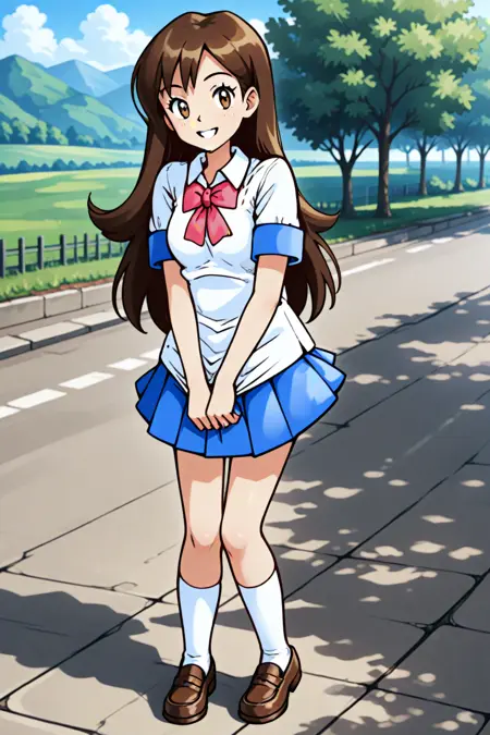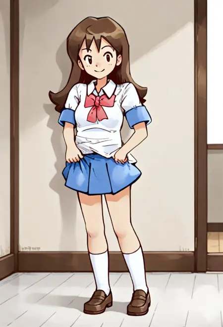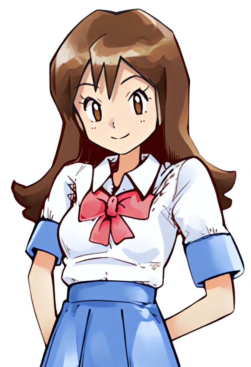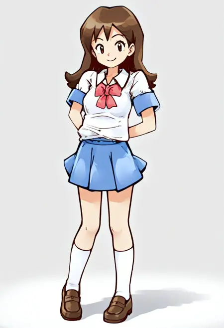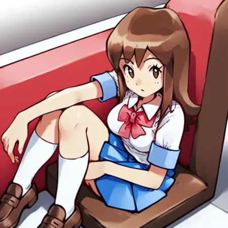 lass \(pokemon rby\), brown eyes, brown hair, long hair, bangs, white shirt, collared shirt, short sleeves, red bowtie, blue skirt, pleated skirt, miniskirt, white socks, kneehighs, loafers, brown footwear