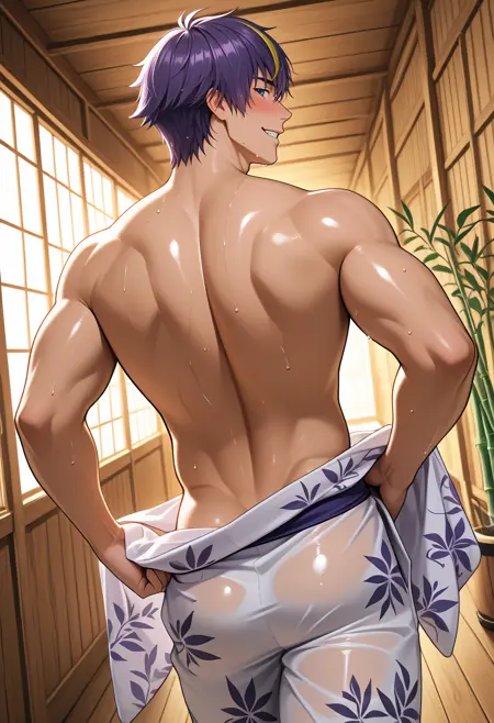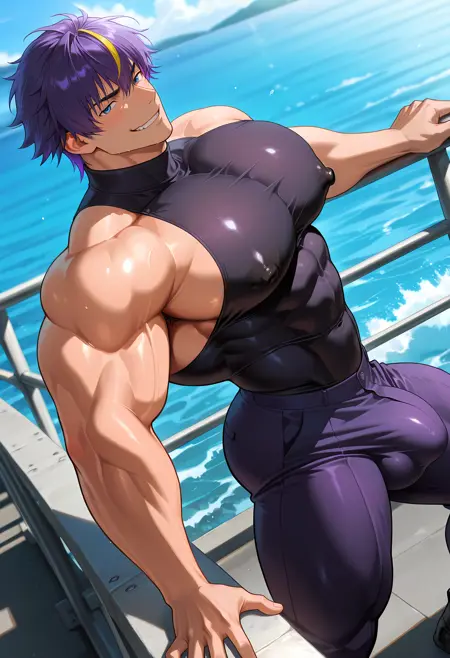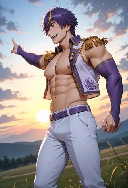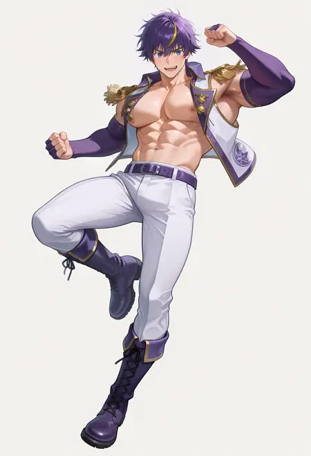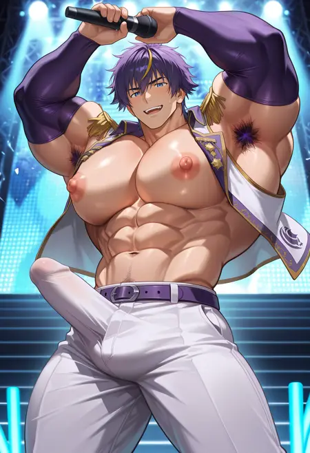 ry0suk3_t5uk1y0, purple hair, blue eyes, streaked hair, multicolored hair, muscular male