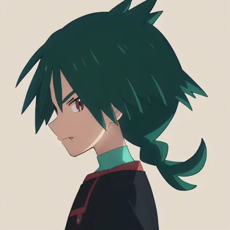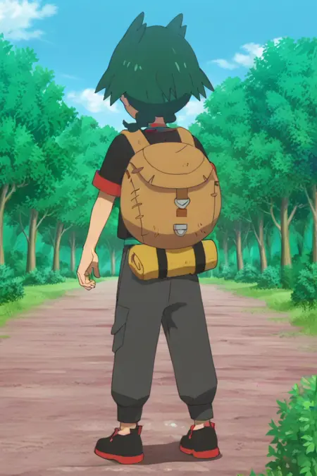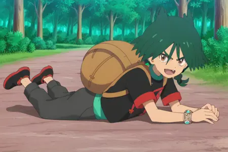 프롬프트: 남성, 녹색 머리카락, 땋은 머리, 갈색 눈, 터키즈색 셔츠, 검은 셔츠, 짧은 소매, 오른팔목 팔찌, 보석, 바지, 신발, 백팩, 야외(숲/하늘/구름/나무/관목)