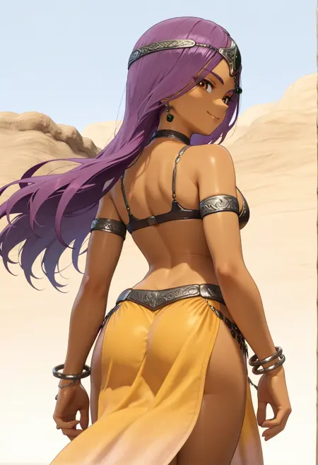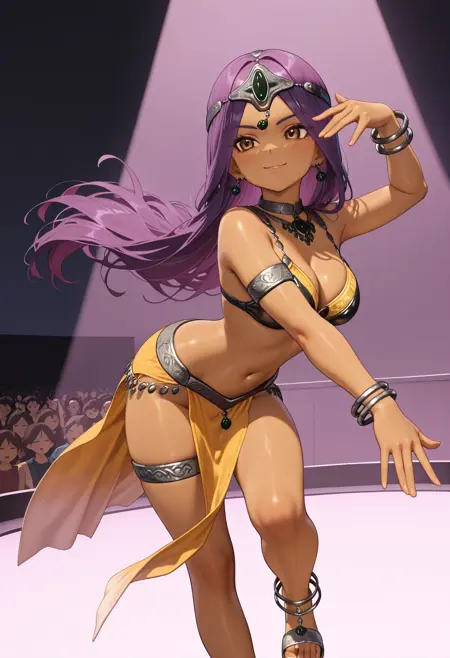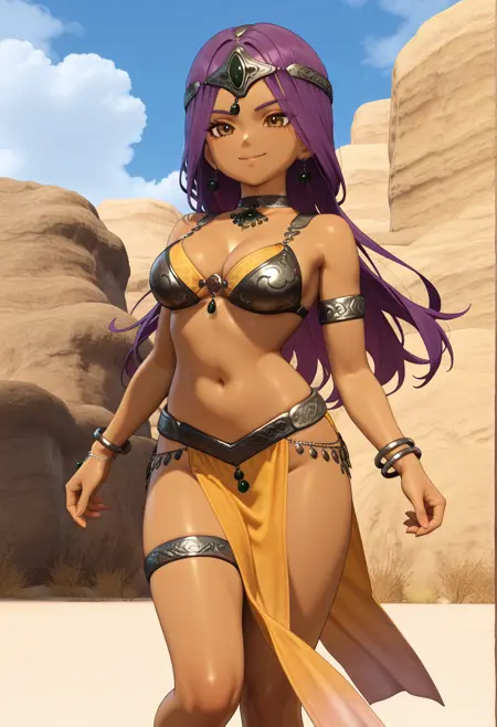 dqh2_maya, purple hair, long hair, brown eyes, dark-skinned female,