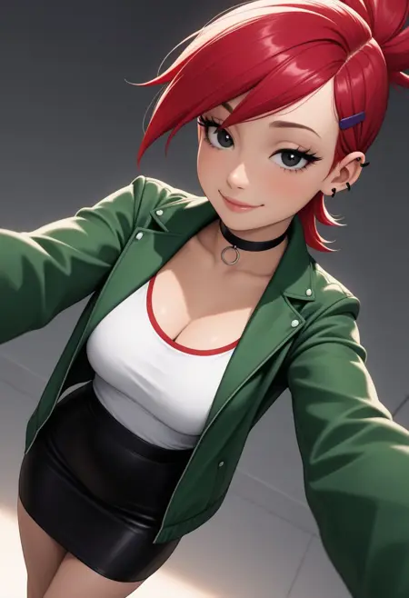 태그: frankiefosterILL, 빨간 머리, 보라색 머리핀, 귀 piercing, 보석, 포니테일, 검은 목걸이, 검은 눈, 녹색 재킷, 치마, 속눈썹, 흰 티셔츠
