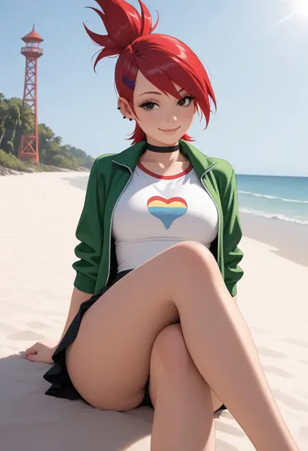 タグ:frankiefosterILL, 赤髪、紫のヘアクリップ、耳ピアス、ジュエリー、ポニーテール、黒いチョーカー、黒い目、緑のジャケット、スカート、まつ毛、白いTシャツ