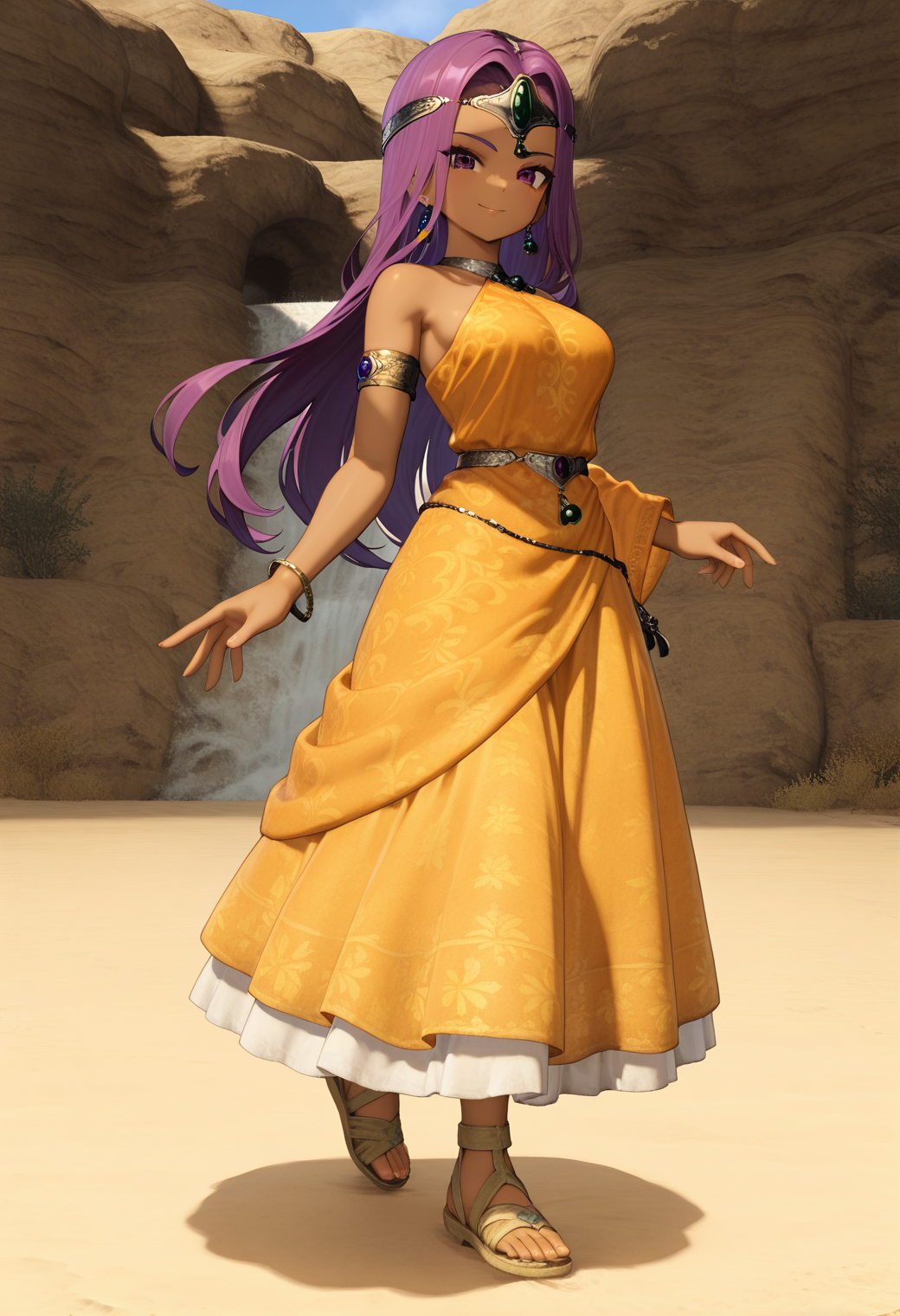 왕관, 귀걸이, 보석, 노란 드레스, 어깨 드러냄, 한쪽만 떨어진 소매, 한쪽 팔찌, 한쪽 손목시계, 샌들