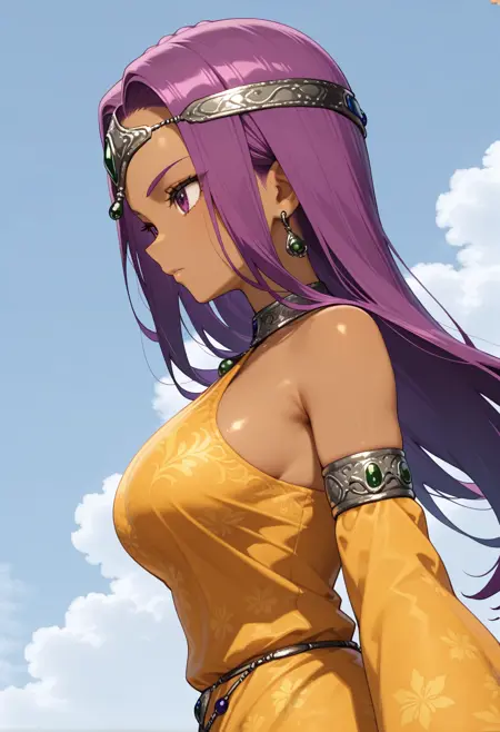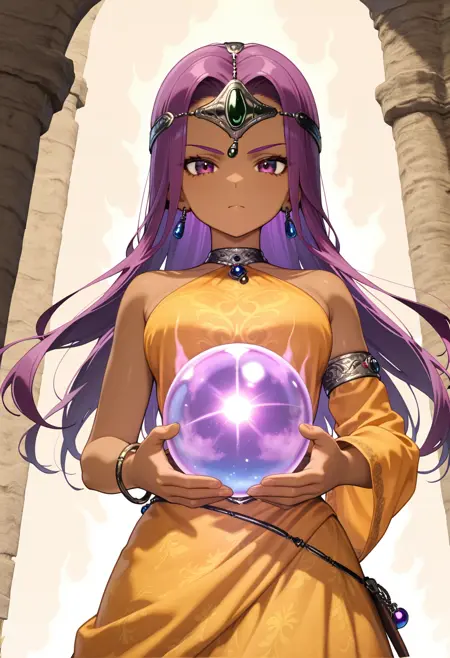dqh2_meena, 보라색 머리카락, 긴 머리카락, 보라색 눈, 검은 피부를 가진 여자,