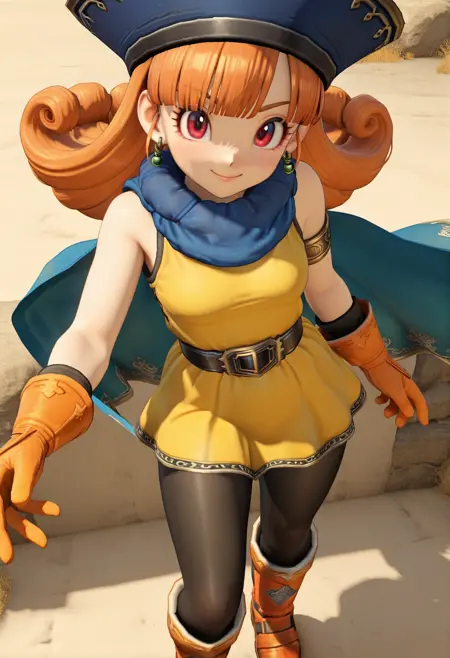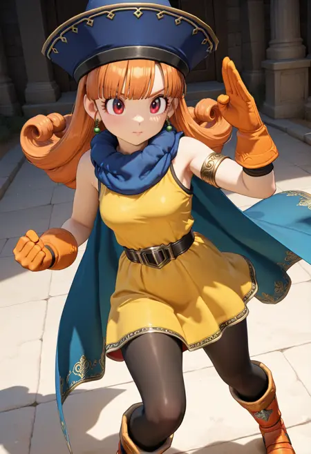 hat, earrings, blue cape, yellow dress, sleeveless, single armlet, orange gloves, belt, black pantyhose, orange boots