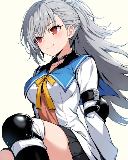 1个女孩,单人,蒂娜,长发,刘海,灰发,红眼,马尾,黄色丝带,百褶裙,项圈,黑裙,护膝,护肘,校服,长袖