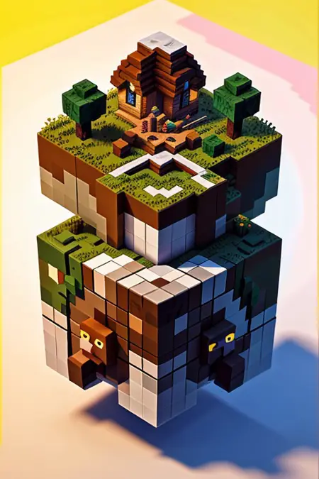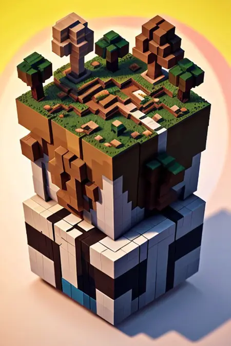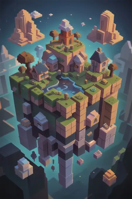 这是世界变形与 Minecraft Skyblock 的混合体。它并不总是生成像素风格,但可以与你最喜欢的 LoRA 风格混搭使用。