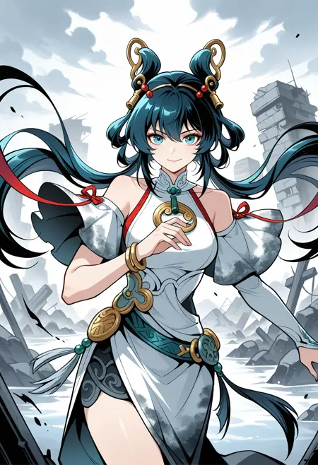 lihenyan,黑色长发,扎成马尾,佩戴金色新月与太阳装饰,淡妆,精致眼妆,浅蓝色眼睛,