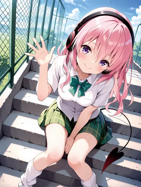 衣装ワード(制服半袖ブラウス)・n_clothes,green bowtie,short sleeve blouse,white blouse,green plaid skirt,black demon tail,loose_socks,loafers,