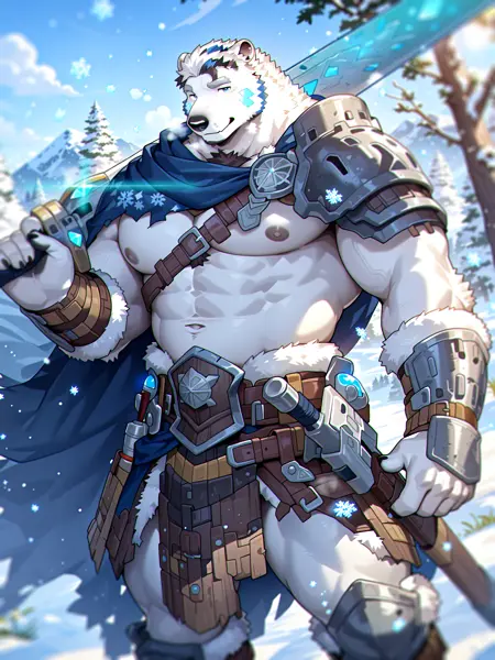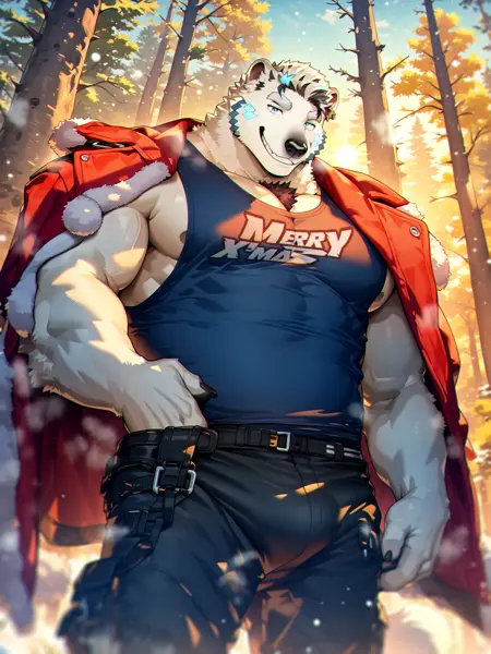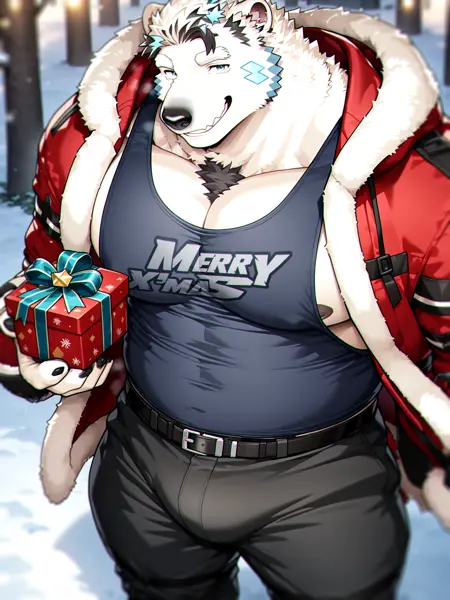 JackFrost, red santa coat, deep blue tanktop, brown belt, black cargo pants, red heavy snow boots