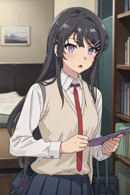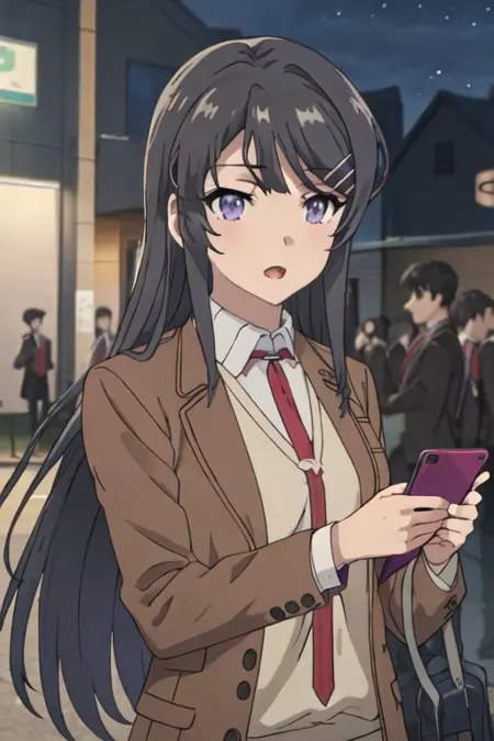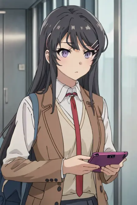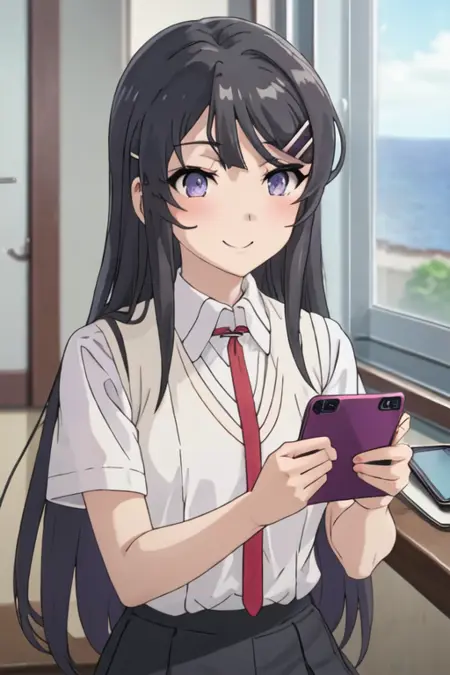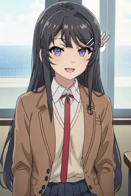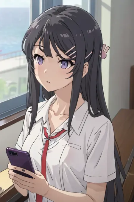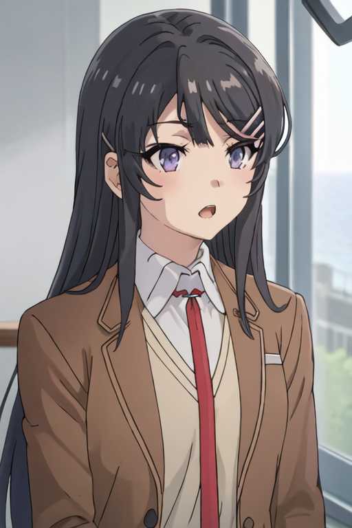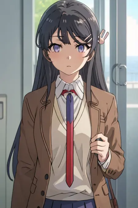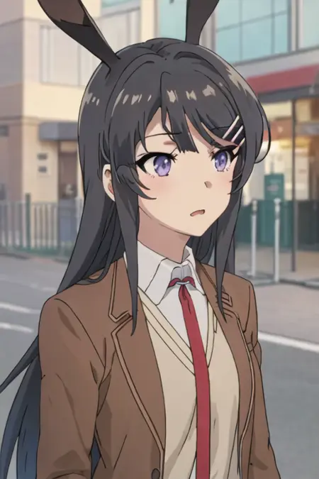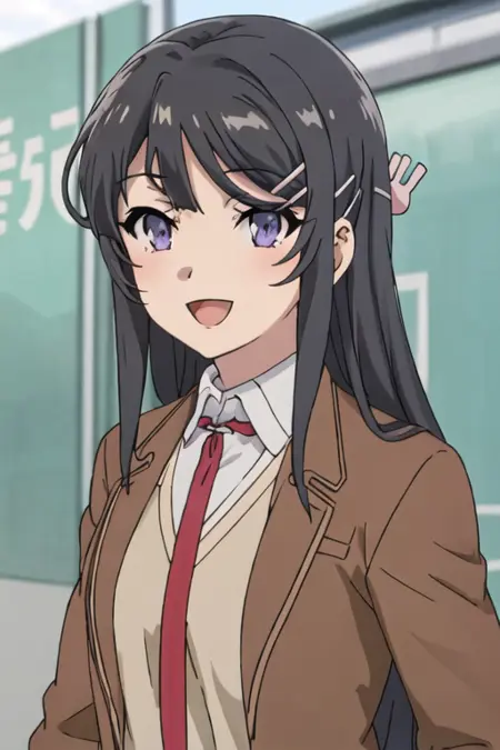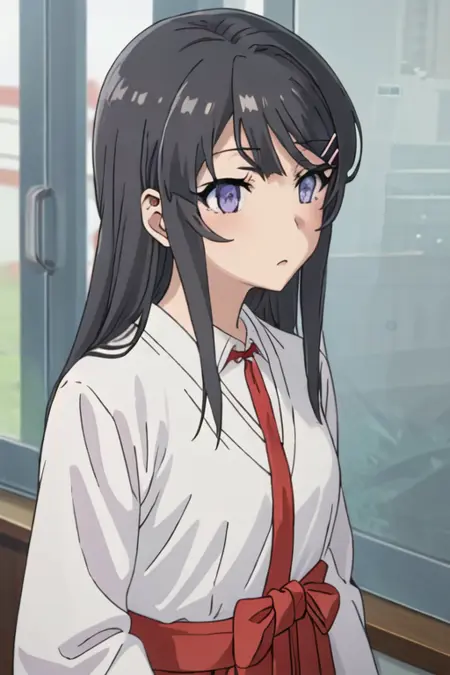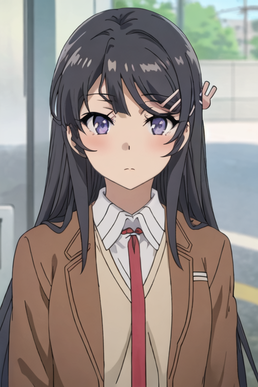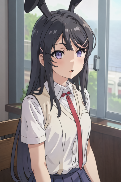 The trigger word is sakurajima_mai_seishunbutayarou, and the recommended tags are best quality, masterpiece, highres, solo, {sakurajima_mai_seishunbutayarou:1.15}, long_hair, black_hair, hair_ornament, hairclip, purple_eyes, rabbit_hair_ornament, blue_eyes, bangs, necktie.