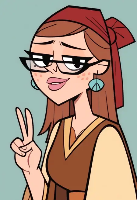 MilesTDRR, 1girl, black glasses, long brown hair, yellow tunic with scalloped edges, blue pants, brown sandals, red headband, brown vest, large turquoise peace sign earrings, black eyes, freckles, light pink lips, lipstick, big lips