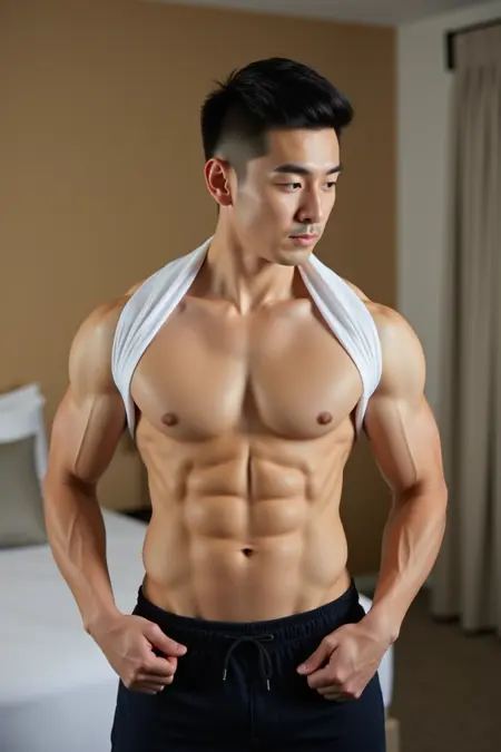 写真のような高品質な画像は、ハンサムで筋肉質な25歳の日本人男性を描写しています。彼は上半身裸で、白いタンクトップを首の後ろに卷き上げて挟み、腋下から後頭部にかけて白い布の帯のみが見える状態です。彼の胸は張り出し、引き締まった体格と明確に見える胸筋を強調しています。ホテルの部屋に立っています。