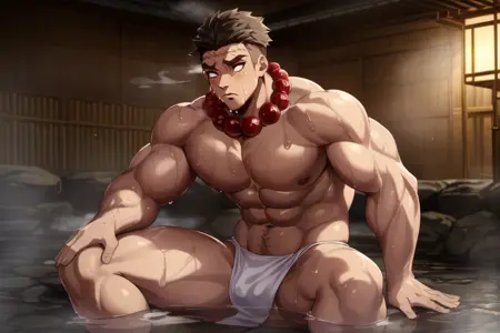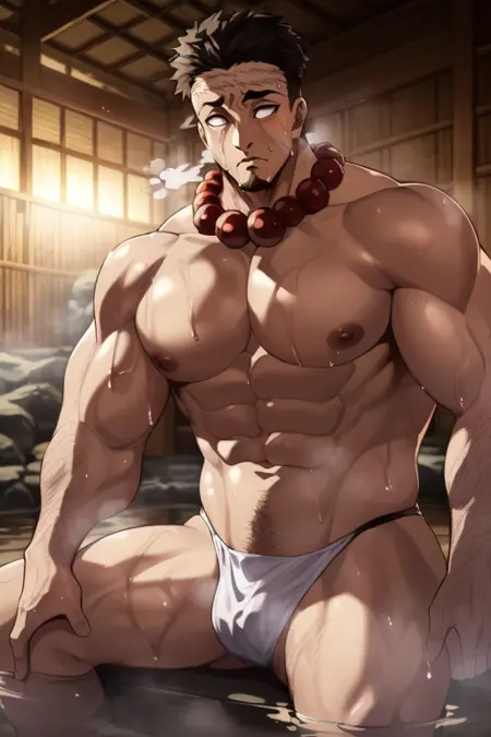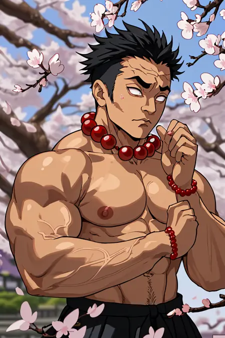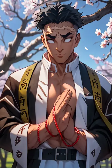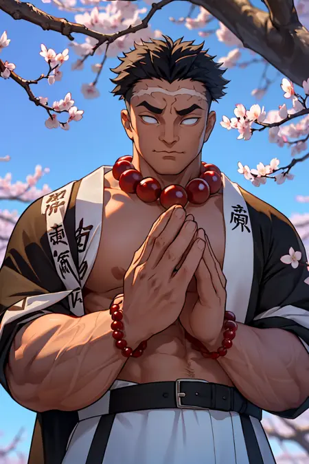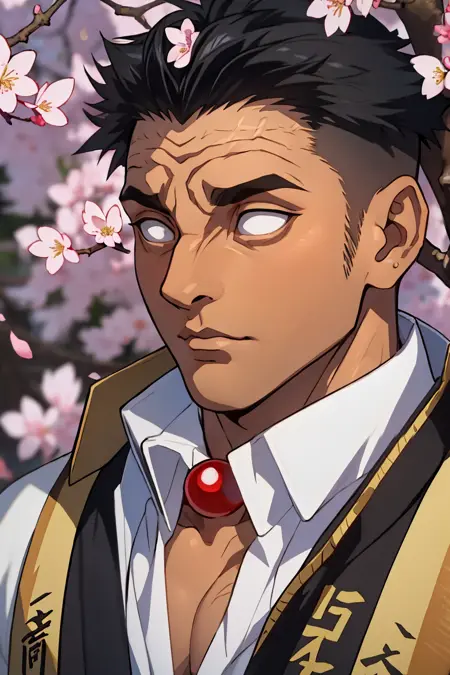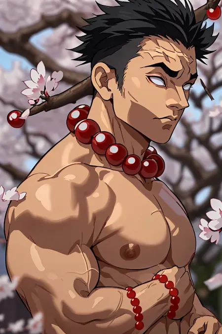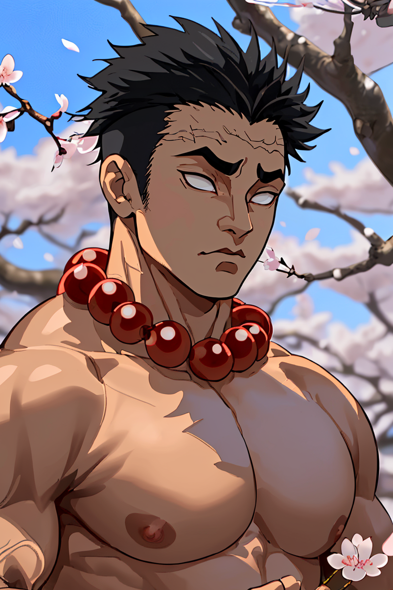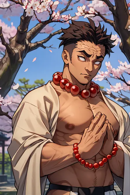 *Note note: I usually use maturemalemix, HMen Mix, and Virile Fusion, but I suppose any would work. Use Adetailer to get the best results. It also helps to specify tags like "Gyomei, Mature Male, Muscular, Black Hair, (no eyes, white pupils, white eyes, blind), red Buddha beads around neck), etc." You can also try to specify his usual clothes like the black and white Demon Slayer uniform, Olive Green Haori/ Happi, etc. as well as the horizontal scar on his forehead (but SD usually mess that up), to get most of his look down, otherwise, you can change or undress him to your liking. lol π