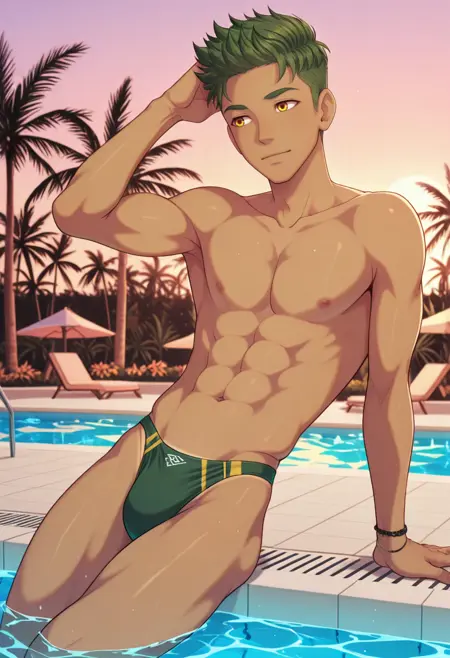 CBAiden, 1boy, green hair, yellow eyes, short hair, tanned