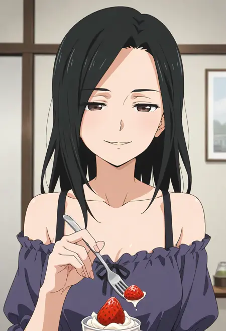 髪型等(必要に応じて): black hair, long hair, black eyes, brown eyes