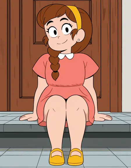 alexiscotc, 黑色眼睛, 棕色头发, 单辫子, 侧发, 黄色发带, 钉状耳环, 粉色连衣裙, 有领连衣裙, 黄色鞋子