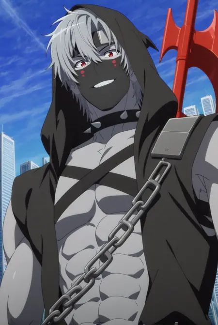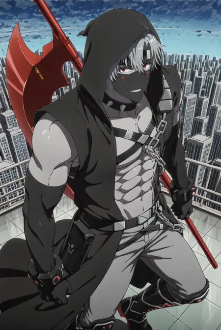 alternate costume, hood up, spiked collar, chain, weapon on back, red scythe, elbow gloves, black gloves, hooded cloak, black cloak, open clothes, abs, chain, sleeveless, grey pants, black belt, topless male, black knee boots, chest harness