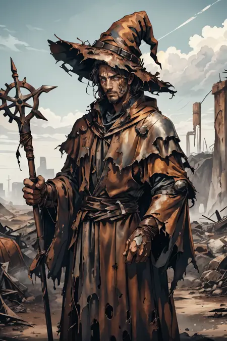 その後、そのアーマーセットに特化したアーマーまたは服のプロンプトを追加してください。例: "rusty wizard robe, holding staff, wizard hat"。