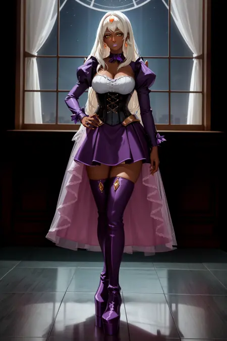 purple dress, puffy sleeves, long sleeves, corset, long skirt, yellow thighhighs, platform boots