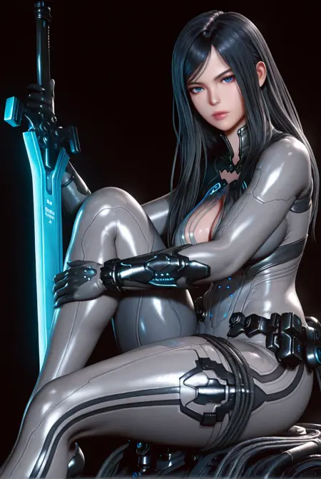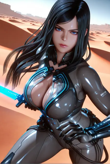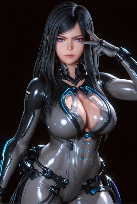 Raven, long hair, black hair, gloves, blue eyes, mole under eye, grey bodysuit, center opening, cleavage cutout, science fiction, skin tight, neon trim, cyberpunk, wire, makeup