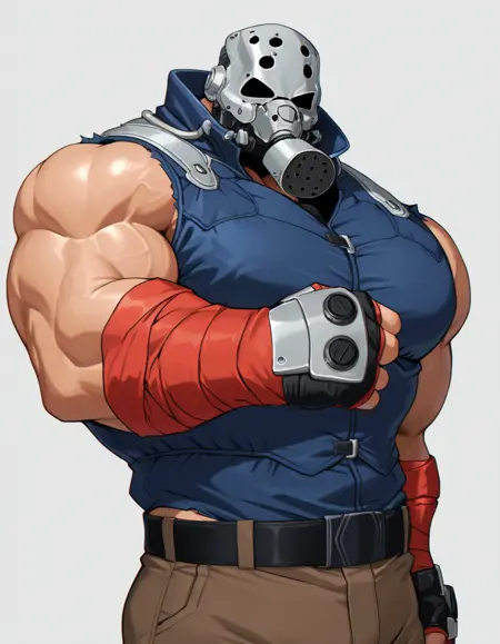 经典装扮:面具、光头、裹绷带的手臂、无指手套、背心、靴子、臂带、裤子