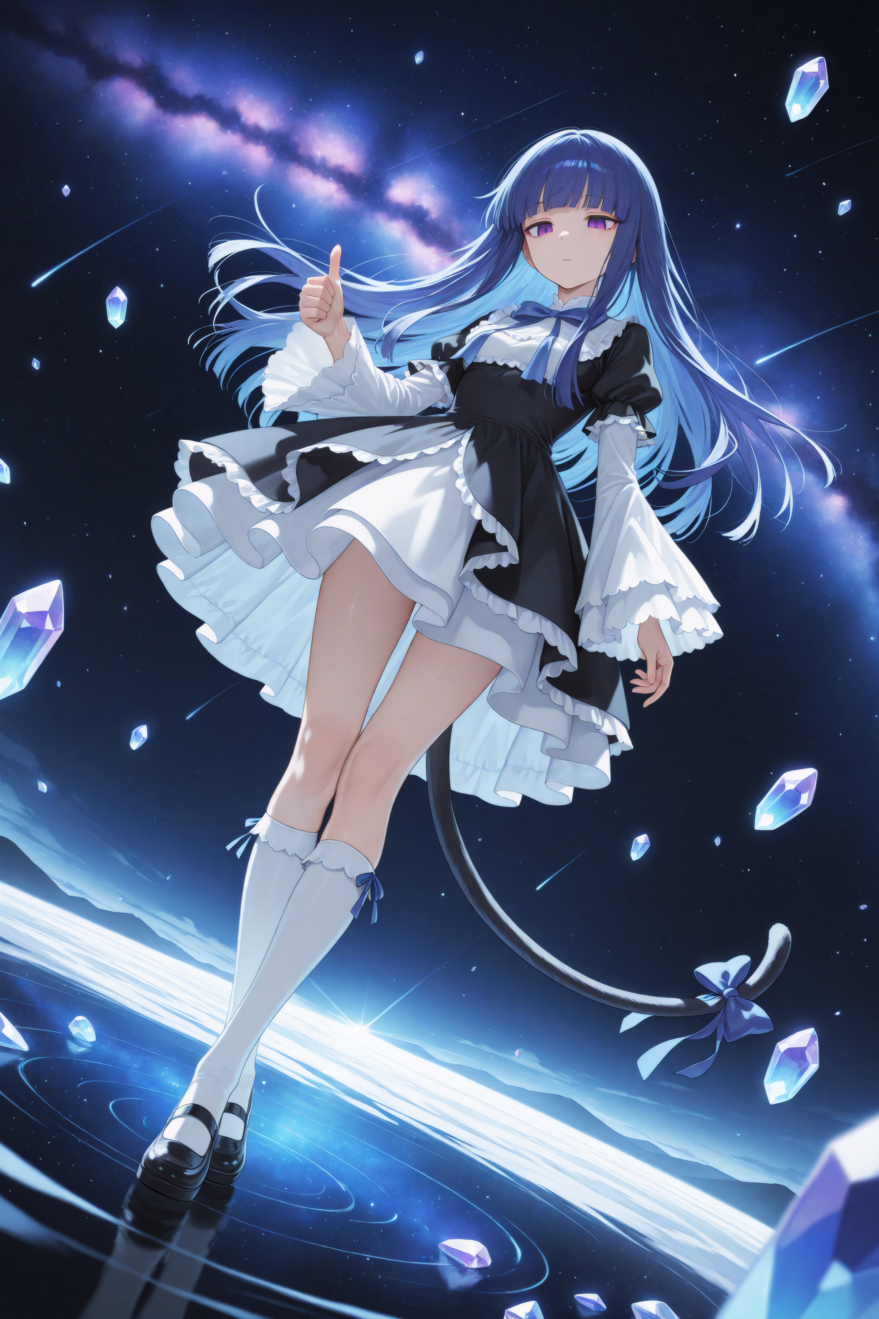 bernkaNoob, black dress, bow, white sleeves, blue hair, small breasts, frilled dress, tail bow, open dress, bow legwear, frilled sleeves, kneehighs, long hair, long sleeves, mary janes