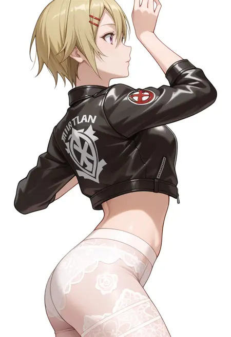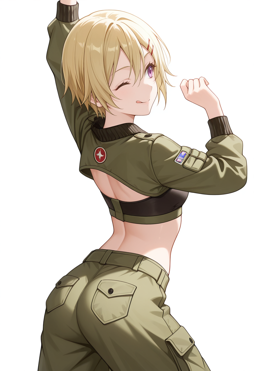 tiss_cnr, 1girl, blonde hair,purple eyes, short hair, hair between eyes,hairclip,