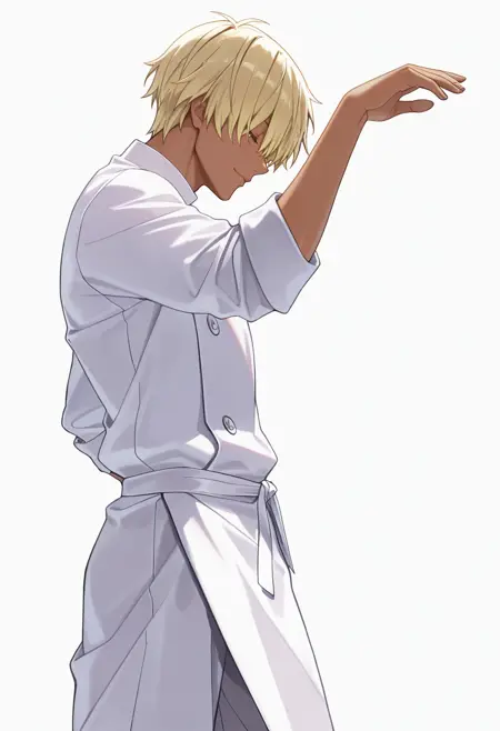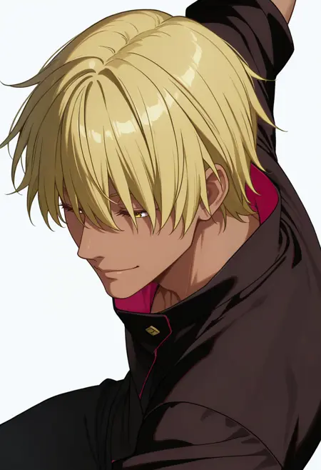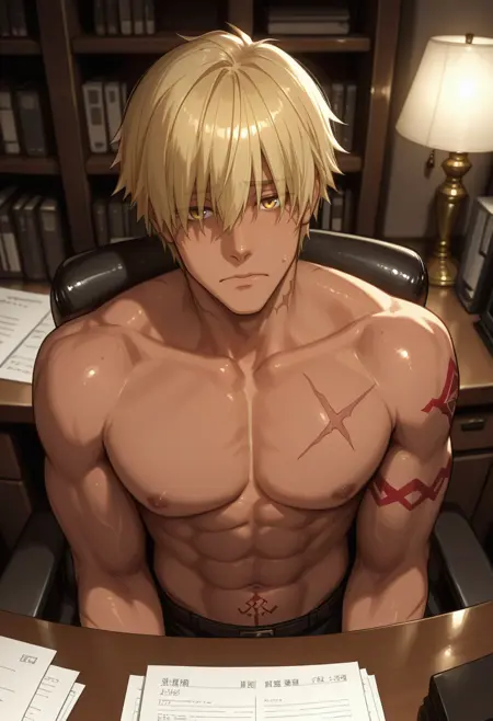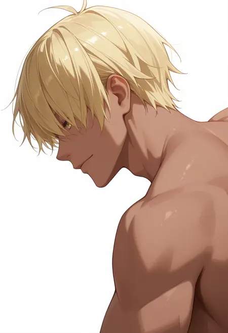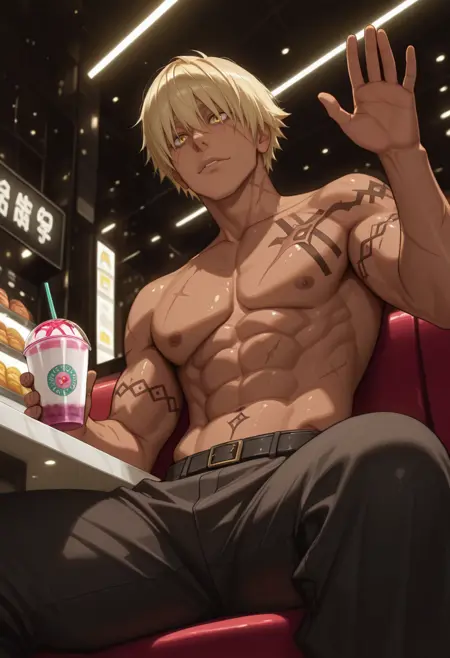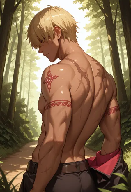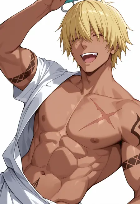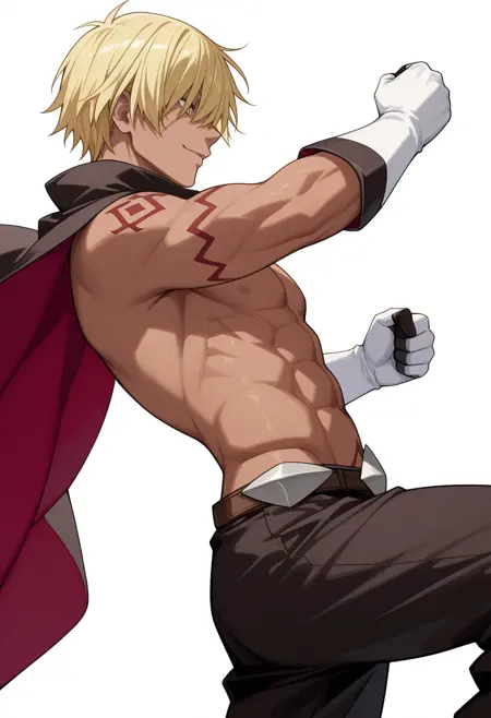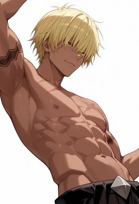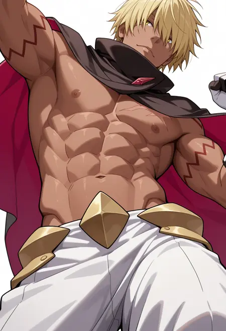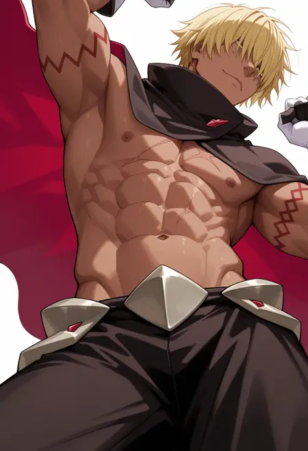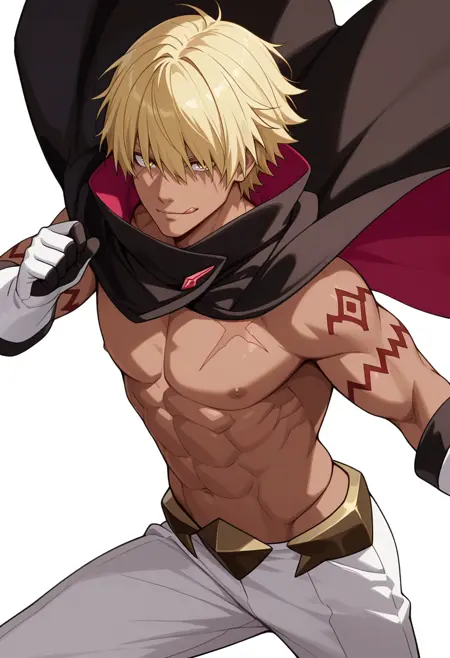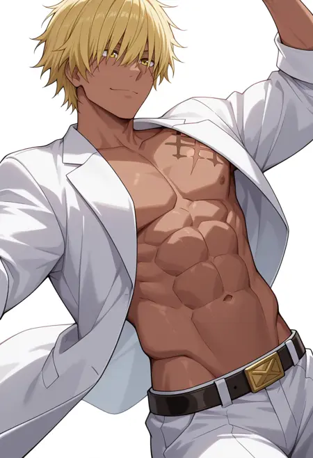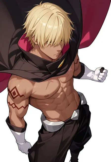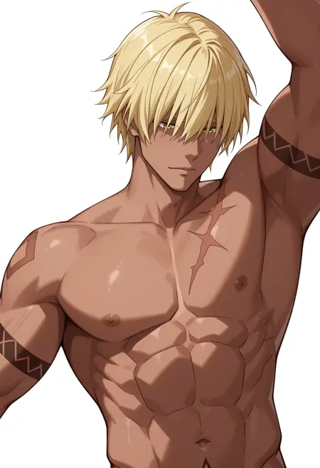 veldora_cnr, 1boy, blonde hair, yellow eyes,dark-skinned male, short hair, abs, scar, tattoo, hair over eyes,