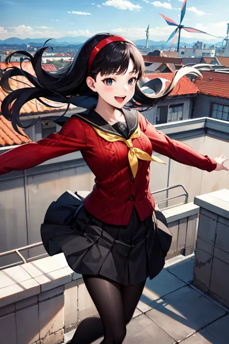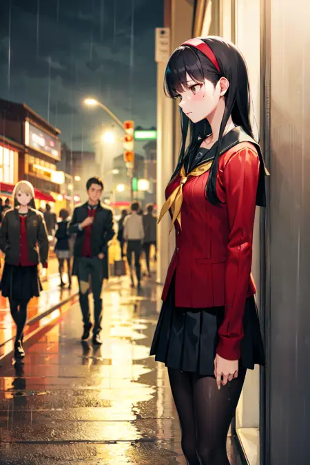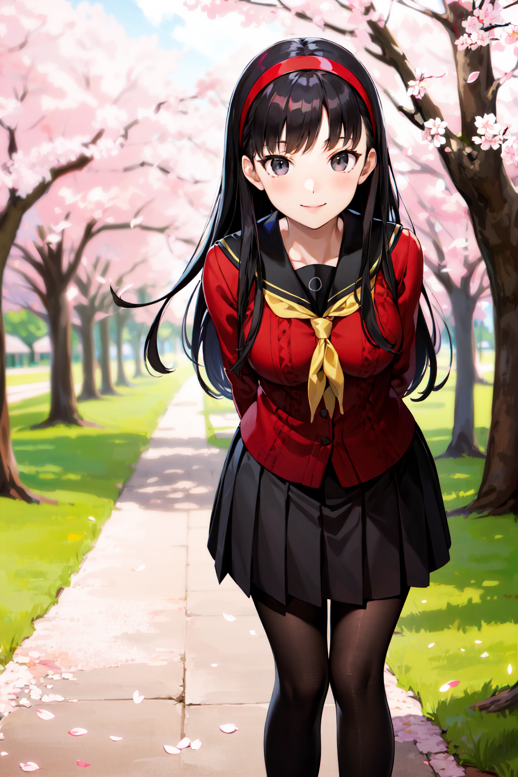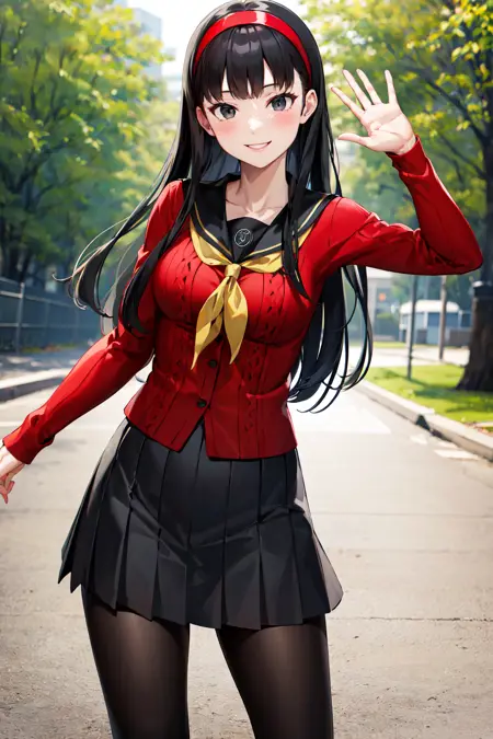 아우트핏1aayukiko, 긴 머리, 헤어밴드, 학교uniform, serafuku, 빨간 카디건, 긴 소매, 검은 치마, 검은 팬티스타킹